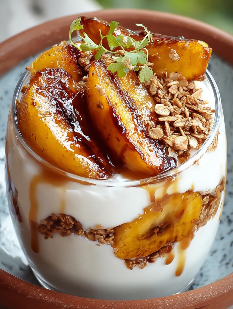 - Assemble the Parfait: Layer caramelized plantains and yogurt in a serving glass.